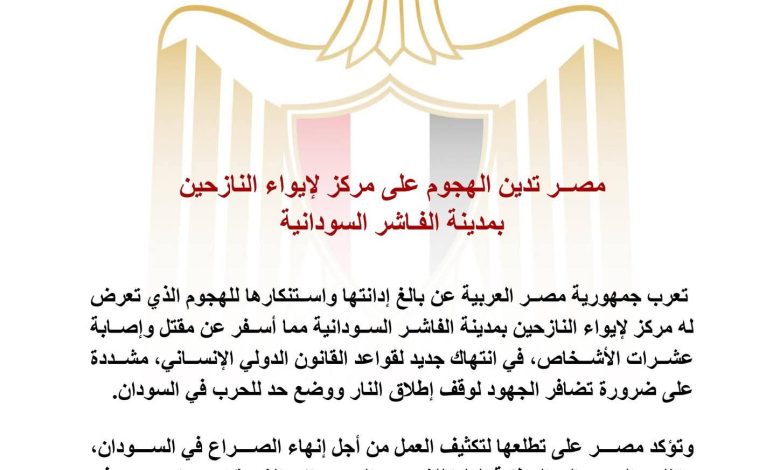 أعربت جمهورية مصر العربية عن بالغ إدانتها واستنكارها للهجوم الذي تعرض له مركز لإيواء النازحين بمدينة الفاشر السودانية مما أسفر عن مقتل وإصابة عشرات الأشخاص، في انتهاك جديد لقواعد القانون الدولي الإنساني، مشددة على ضرورة تضافر الجهود لوقف إطلاق النار ووضع حد للحرب في السودان