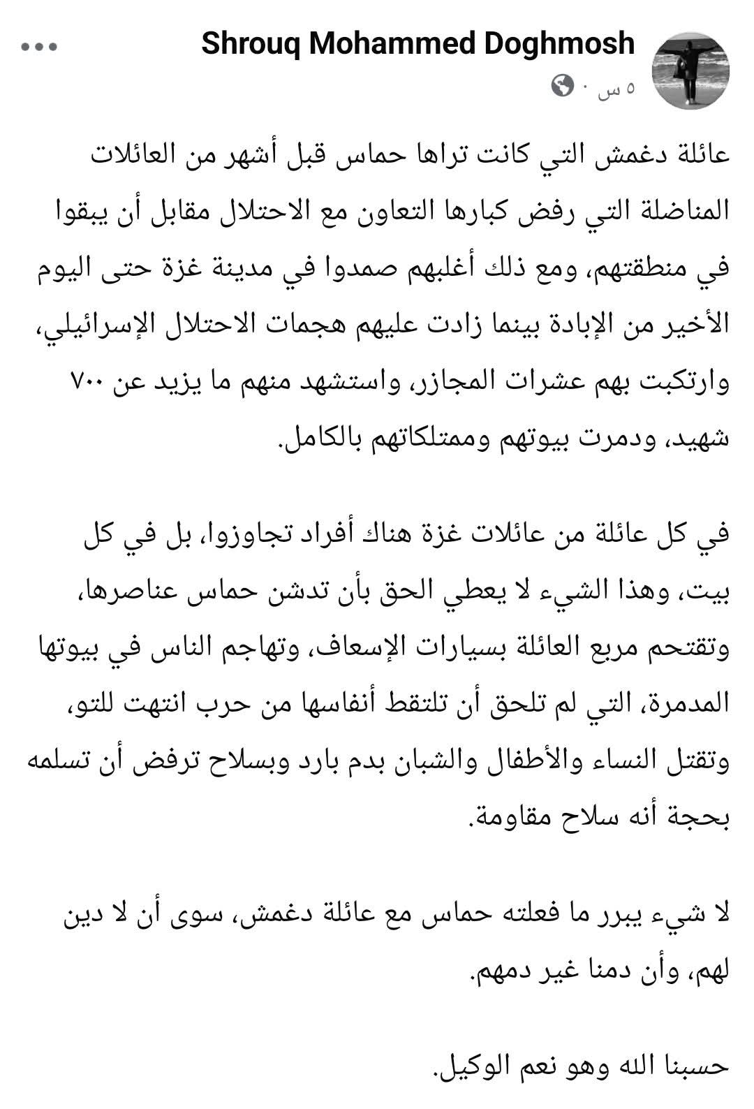وجاء في منشور كتبته شروق محمد دغمش على صفحتها الرسمية أن عائلتها، التي “كانت تُعتبر في نظر حماس قبل أشهر من العائلات المناضلة التي رفضت التعاون مع الاحتلال”، تتعرض اليوم لهجوم داخلي غير مبرر، بعد أن صمد أفرادها طوال فترة الحرب الأخيرة وتكبدت العائلة أكثر من ٧٠٠ شهيد، إضافة لتدمير كامل لمنازلها وممتلكاتها.