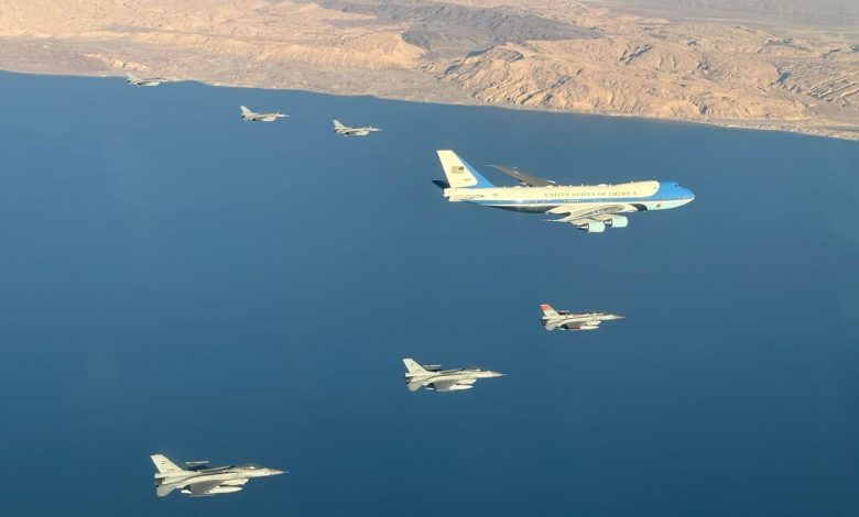 وكان مسؤولون كبار في البيت الأبيض نشروا مشاهد من الطائرة الرئاسية الأمريكية للمقاتلات الحربية المصرية من طراز F16 وهي ترافق طائرة الرئيس الأمريكي دونالد ترامب لحظة دخولها المجال الجوي المصري حتى هبوطها في مطار شرم الشيخ الدولي.