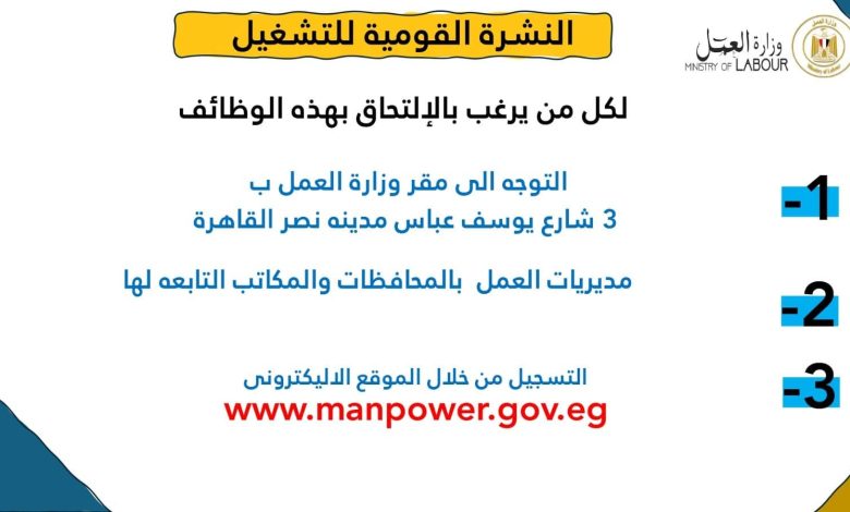 وأوضحت الوزارة أن التقديم متاح خلال شهري أكتوبر ونوفمبر 2025، من خلال مكتب الإدارة العامة للتشغيل بمقر الوزارة القديم في مدينة نصر، أو عبر مديريات العمل بالمحافظات، أو من خلال أرقام وعناوين الشركات المرفقة بالبيان، وكذلك عبر الموقع الرسمي لوزارة العمل على شبكة الإنترنت.