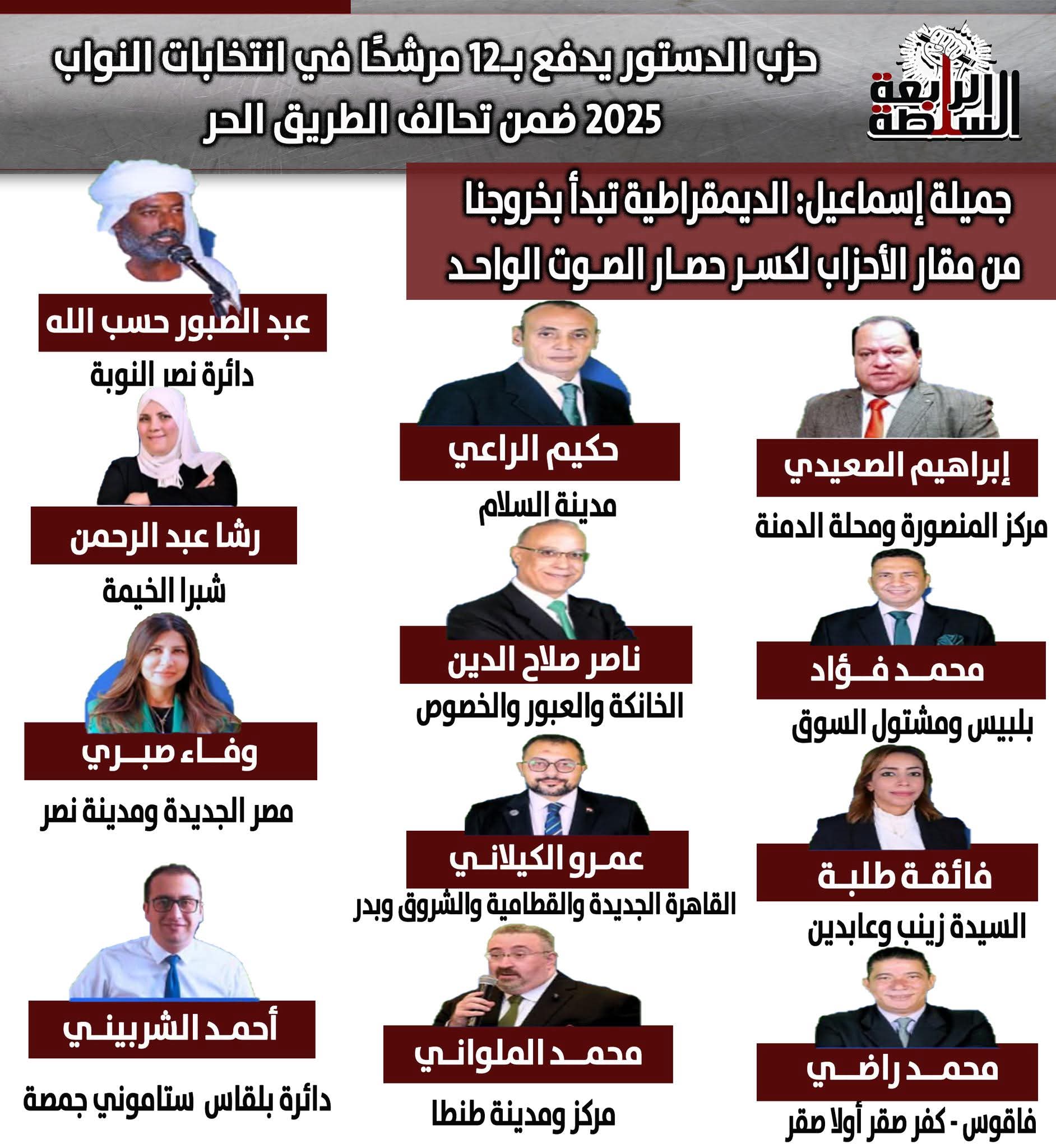 دفع حزب الدستور بـ 12 مرشحًا في عدد من الدوائر، من بينهم: