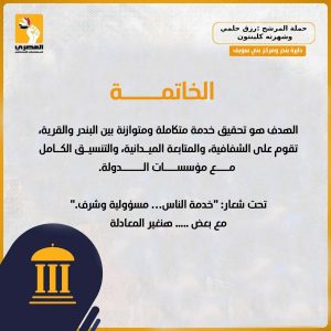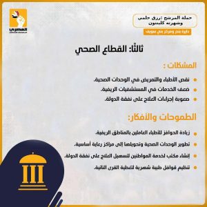 وأوضح المرشح أن برنامجه يتضمن خطة شاملة لتطوير القطاعات الحيوية داخل الدائرة، تشمل الزراعة، التعليم، الصحة، التضامن الاجتماعي، الصرف الصحي والصناعي، والمشروعات الصغيرة، بما يضمن تحسين مستوى الخدمات والمعيشة للمواطنين.