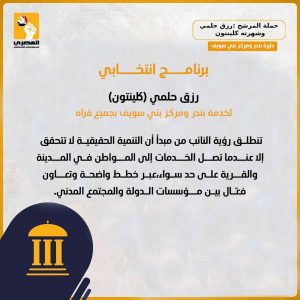 رزق حلمي كلينتون يعلن برنامجه الانتخابي لخدمة بندر ومركز بني سويف تحت شعار “خدمة الناس مسؤولية وشرف