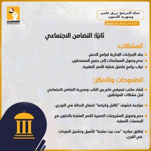وفي مجال التضامن الاجتماعي، تعهد بإنشاء مكتب تنسيقي دائم بين النائب ومديرية التضامن الاجتماعي لحل مشكلات المواطنين، ومراجعة كشوف “تكافل وكرامة” لضمان العدالة، إلى جانب دعم المشروعات الصغيرة للأسر المنتجة وإطلاق مبادرة “ست بيت منتجة”.
