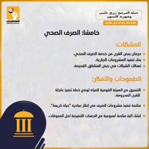 أما في القطاع الصحي، فقد أكد أهمية تحسين أوضاع الأطباء والتمريض في القرى، وتطوير الوحدات الصحية، وتيسير إجراءات العلاج على نفقة الدولة، إضافة إلى تنظيم قوافل طبية شهرية لخدمة المناطق النائية.