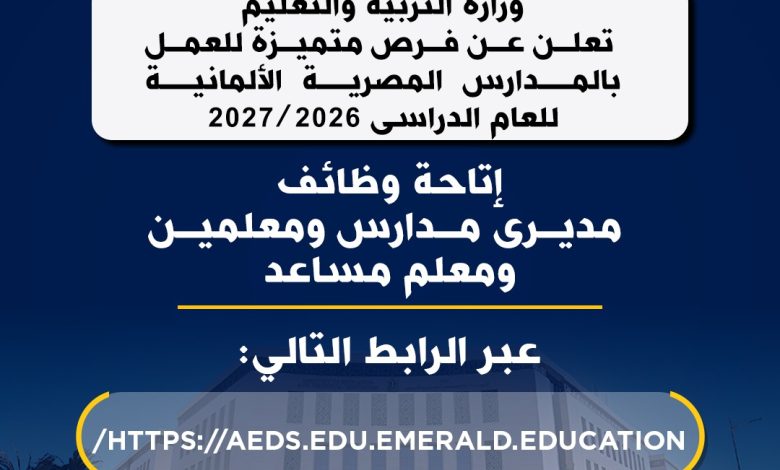 أعلنت وزارة التربية والتعليم فتح باب التقديم لوظائف (مديري مدارس – معلمين رياض أطفال – معلم مساعد رياض أطفال) بالمدارس المصرية الألمانية للعام الدراسى 2026 / 2027.