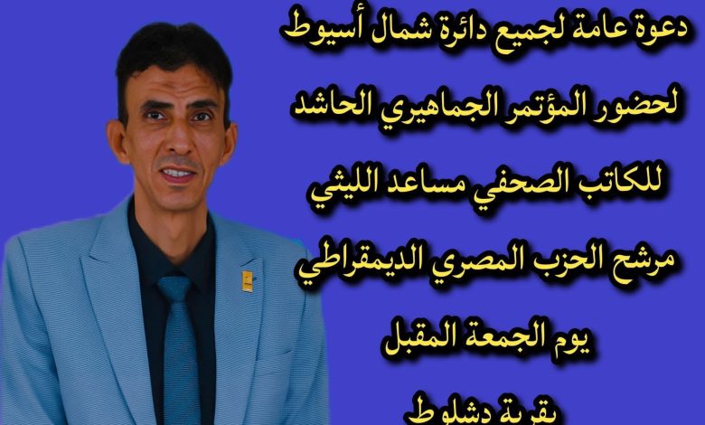 وجّه الكاتب الصحفي مساعد الليثي، مرشح الحزب المصري الديمقراطي الاجتماعي لمجلس النواب عن دائرة ديروط والقوصية ومنفلوط (رمز القطار – رقم 13)، دعوة عامة لأهالي الدائرة الكرام لحضور المؤتمر الجماهيري الحاشد الذي يقام يوم الجمعة المقبل بقرية دشلوط.