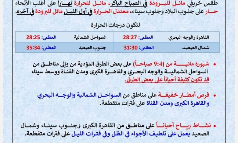 كما يشهد الطقس شبورة مائية من (9:4 صباحاً على بعض الطرق المؤدية من وإلى مناطق من السواحل الشمالية والوجه البحري والقاهرة الكبرى ومدن القناة ووسط سيناء قد تكون كثيفة أحياناً على بعض الطرق.