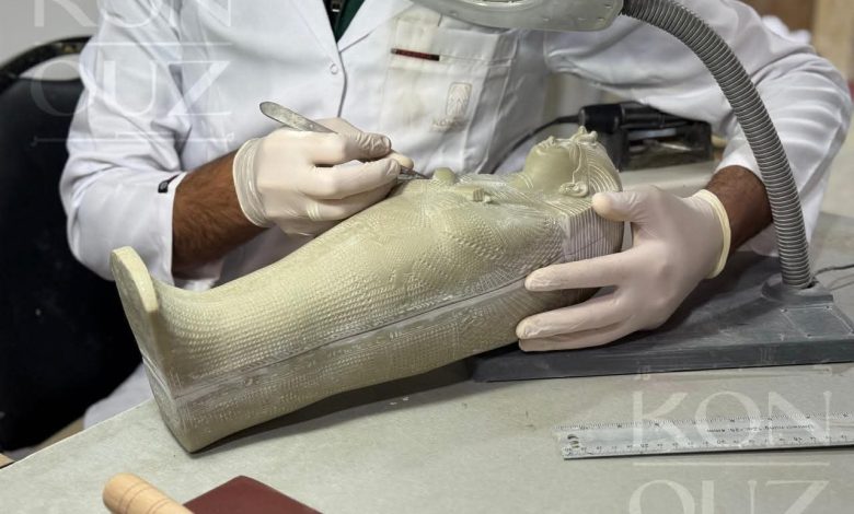 وأوضح اللواء هشام شعراوي رئيس مجلس إدارة شركة كنوز مصر للنماذج الأثرية، أن تصميم الدعوة مر بعدة مراحل دقيقة تعكس حساسية العمل الفني المُستمد من إرث مصر الحضاري، بدأت العملية من قسم النحت، حيث تولّى الفنانون تجسيد الزخارف والرموز والكتابات الهيروغليفية بدقة التماثل الأصلية، ثم انتقلت إلى مراحل الاستنساخ فـالتذهيب فـالتلوين، قبل أن يُغلّف التابوت من الداخل بقماش المخمل الفاخر، لتظهر في صورتها النهائية التي تليق بعظمة الاحتفالية ومكانة المتحف.