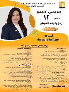 طقدمت المرشحة إيريني وديع، ممثلة عن الحزب المصري الديمقراطي، برنامجها الانتخابي في صورة إنفوجراف مبسط يبرز أهم محاور رؤيتها للنهوض بالمجتمع ودعم قضايا المرأة.