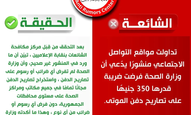 نفى مركز مكافحة الشائعات التابع لنقابة الإعلاميين برئاسة الدكتور طارق سعده، نقيب الإعلاميين، ما تداوله بعض حسابات على مواقع وسائل التواصل الاجتماعي من منشور يدّعي أن وزارة الصحة فرضت ضريبة قدرها 350 جنيهًا على تصاريح دفن الموتى.