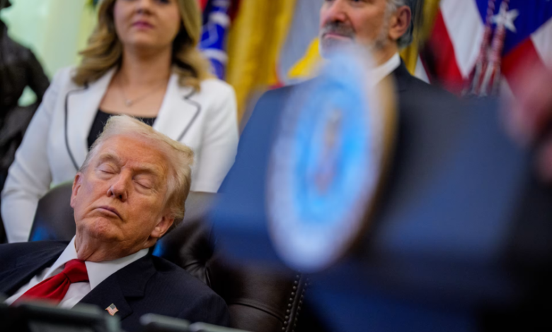 أثارت صور متداولة على مواقع التواصل الاجتماعي للرئيس الأمريكي دونالد ترامب نائما خلال مؤتمر صحفي في المكتب البيضاوي موجة من الجدل والانتقادات من معارضيه.