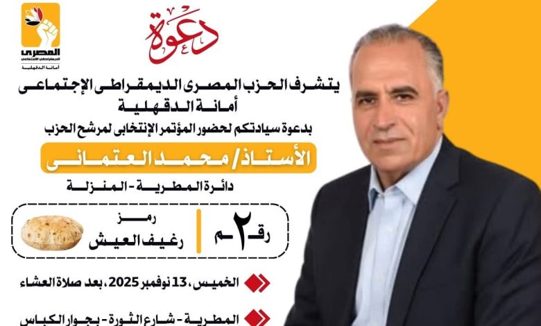 المطرية والمنزلة تستعدان لأكبر مؤتمر جماهيري دعمًا لمرشح الحزب المصري الديمقراطي الاجتماعي محمد العتماني