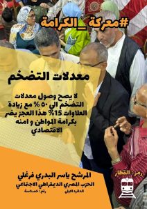 كما تناول المرشح انعكاسات ارتفاع معدل التضخم على الأسر المصرية، ودعا إلى وضع سياسات اقتصادية أكثر توازنًا وتفعيل الرقابة على الأسواق للحد من الارتفاع غير المبرر في الأسعار، إلى جانب دعم الفئات الأكثر تضررًا.