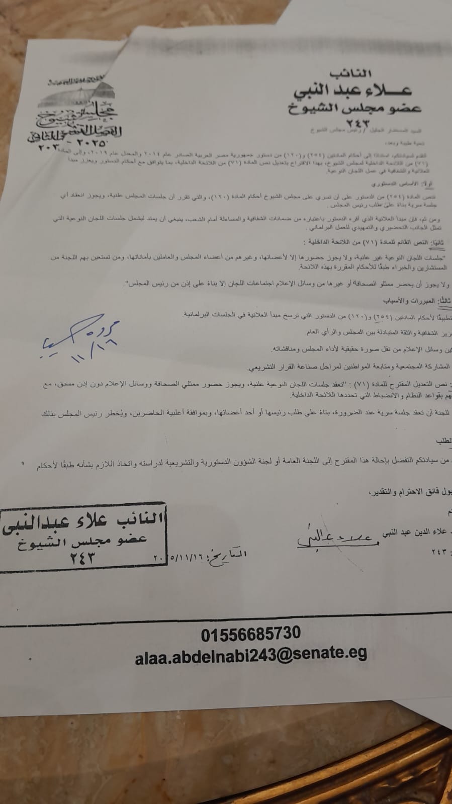 تقدم النائب علاء عبد النبي، وكيل لجنة الزراعة والري والأمن الغذائي بمجلس الشيوخ، باقتراح إلى المستشار الجليل رئيس مجلس الشيوخ، لتعديل نص المادة (71) من اللائحة الداخلية للمجلس، بما يضمن علانية جلسات اللجان النوعية، تعزيزًا لمبادئ الشفافية والمساءلة التي كفلها الدستور.