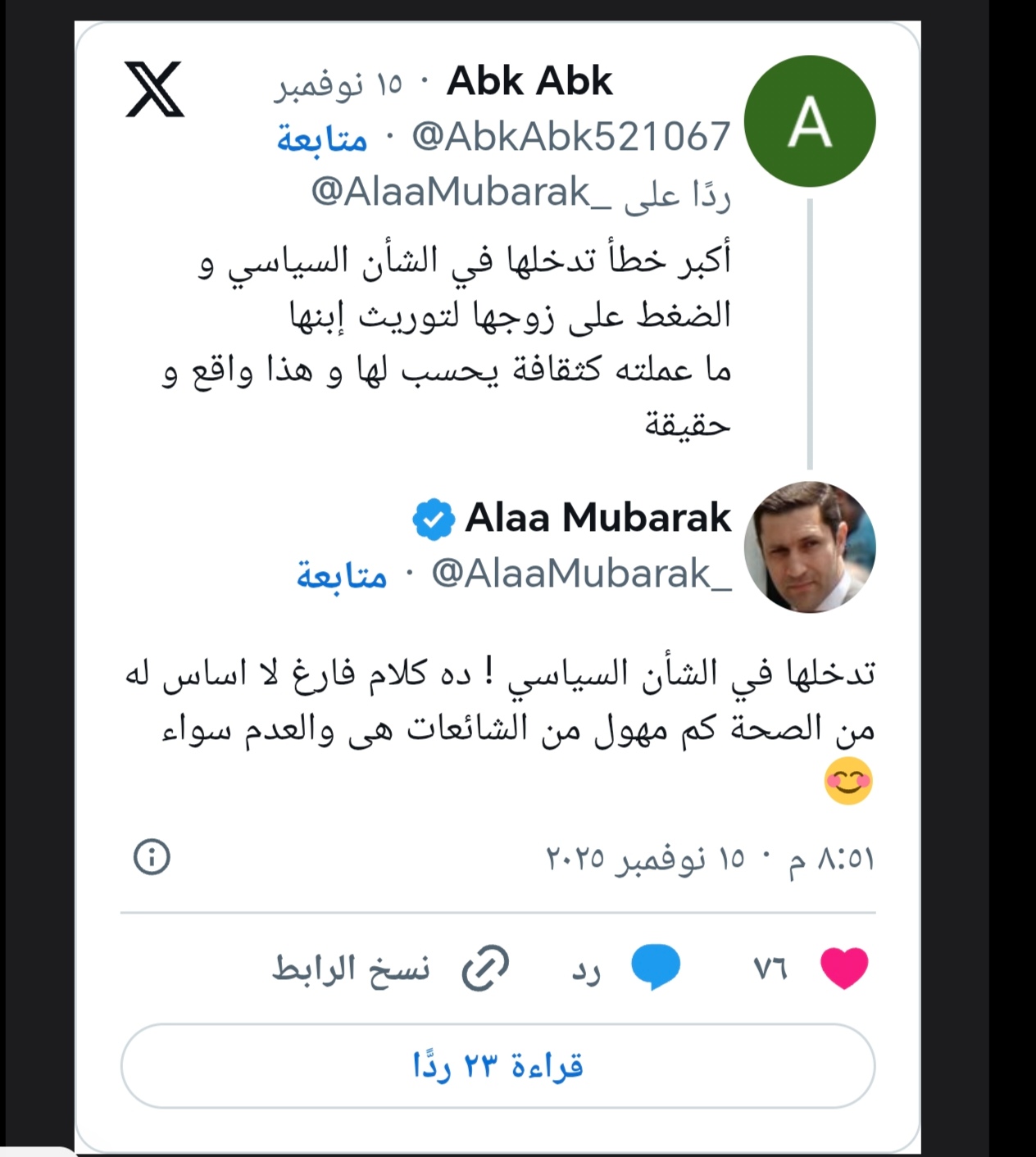 من جانبه رد علاء مبارك على التعليق قائلا: “تدخلها في الشأن السياسي ! ده كلام فارغ لا أساس له من الصحة كم مهول من الشائعات هي والعدم سواء”.