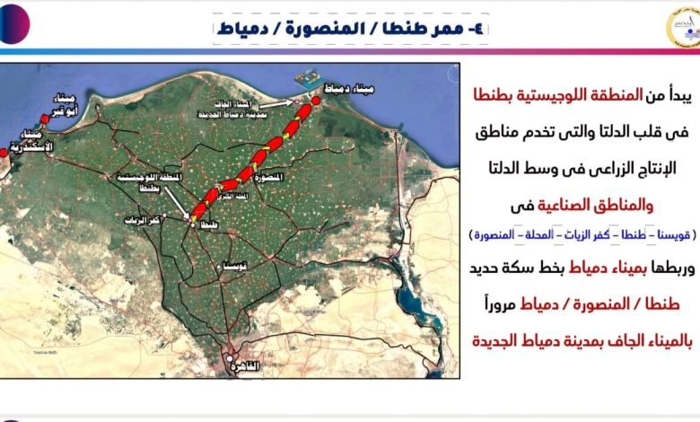بالإضافة الى ممر القاهرة – الإسكندرية اللوجيستي الذي يبدأ من محطة سكك حديد قطارات صعيد مصر بمنطقة بشتيل مروراً بميناء السادات الجاف وميناء السادس من أكتوبر الجاف وربطهما بشبكة السكك الحديدية علي خط بشتيل – الاتحاد – ايتاي البارود – القباري من خلال وصلتي كفر داود – السادات بطول 36 كم والمناشي – 6 اكتوبر بطول 68 كم وحتي ميناء الإسكندرية الكبير ، وممر طنطا – المنصورة – دمياط اللوجيستي الذي يبدأ من المنطقة اللوجستية بطنطا في قلب الدلتا والتي تخدم مناطق الإنتاج الزراعي في وسط الدلتا والمناطق الصناعية في ( قويسنا – طنطا – كفر الزيات – المحلة – المنصورة ) وربطها بميناء دمياط بخط سكة حديد ( طنطا / المنصورة / دمياط ) مروراً بالميناء الجاف بمدينة دمياط الجديدة