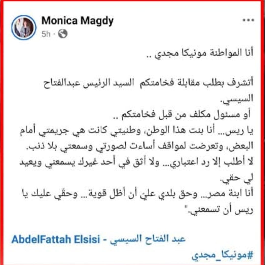 وقالت في تدوينتها: “أنا المواطنة مونيكا مجدي.. أتشرف بطلب مقابلة فخامتكم السيد الرئيس عبد الفتاح السيسي. أومسؤول مكلف من قبل فخامتكم.. يا ريس، أنا بنت هذا الوطن، وطنيتي كانت هي جريمتي أمام البعض، وتعرضت لمواقف أساءت لصورتي وسمعتي بلا ذنب”.