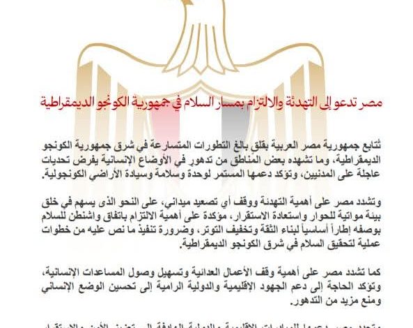 تتابع جمهورية مصر العربية بقلق بالغ التطورات المتسارعة في شرق جمهورية الكونغو الديمقراطية، وما تشهده بعض المناطق من تدهور فى الأوضاع الإنسانية يفرض تحديات عاجلة على المدنيين، وتؤكد دعمها المستمر لوحدة وسلامة وسيادة الأراضى الكونغولية.