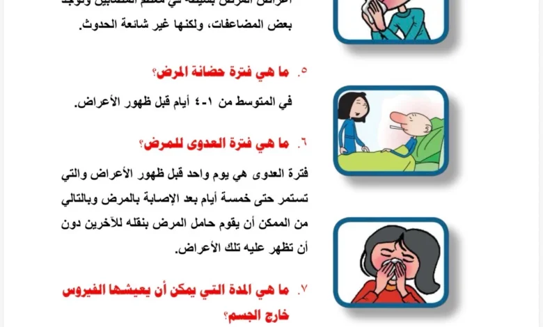 وقالت: فترة العدوى هي يوم واحد قبل ظهور الأعراض والتي تستمر حتى خمسة أيام بعد الإصابة بالمرض وبالتالي من الممكن أن يقوم حامل المرض بنقله للآخرين دون أن تظهر عليه تلك الأعراض وتابعت : بعض الفيروسات والبكتريا يمكن أن تعيش لمدة ساعتين أو أكثر على الأسطح مثل المناضد ومقابض الأبواب والمكاتب. إن غسل الأيدي المنتظم سوف يساعدك على تقليل فرص التلوث بالفيروس من هذه الأسطح الملوثة.