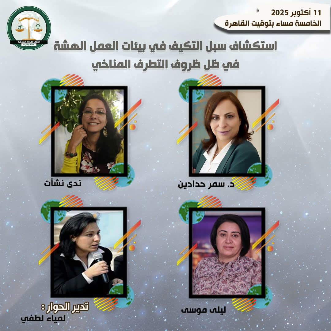 أقامت المؤسسة المصرية للوعي والتنمية مساء اليوم 11 اكتوبر لقاء عبر منصة زوم بالتعاون مع ائتلاف العدالة المناخية عدالة جندرية يهدف إلى استكشاف السبل العملية لتعزيز صمود بيئات العمل الهشة في ظل التحديات المتزايدة التي يفرضها التطرف المناخي.
