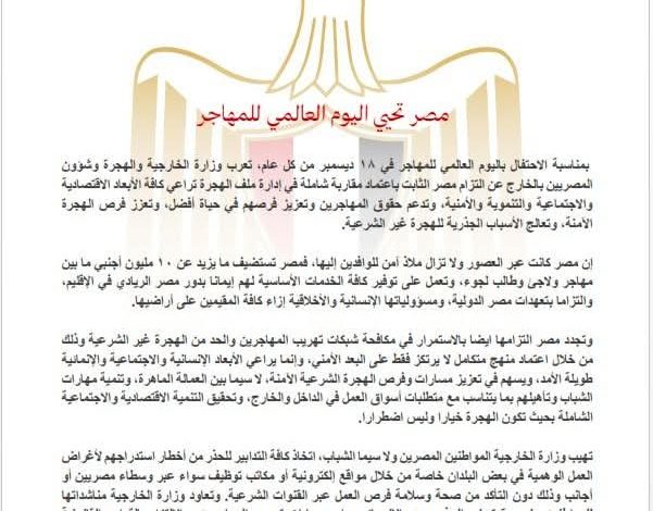 بمناسبة الاحتفال باليوم العالمي للمهاجر في ١٨ ديسمبر من كل عام، تعرب وزارة الخارجية والهجرة وشؤون المصريين بالخارج عن التزام مصر الثابت باعتماد مقاربة شاملة في إدارة ملف الهجرة تراعي كافة الأبعاد الاقتصادية والاجتماعية والتنموية والأمنية، وتدعم حقوق المهاجرين وتعزيز فرصهم في حياة أفضل، وتعزز فرص الهجرة الآمنة، وتعالج الأسباب الجذرية للهجرة غير الشرعية.