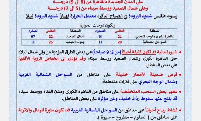 وتوقع الخبراء تكون شبورة مائية صباحا قد تكون كثفة أحيانا على بعض الطرق المؤدية من وإلى شمال البلاد حتى القاهرة الكبرى وشمال الصعيد ووسط سيناء وقد تؤدي إلى انخفاض الرؤية الأفقية على بعض المناطق من الوجه البحري والسواحل الشمالية الغربية، فرص ضعيفة لأمطار خفيفة على مناطق من السواحل الشمالية الغربية وشمال الوجه البحري على فترات متقطعة، ونشاط رياح على مناطق من السواحل الغربية قد تكون مثيرة للرمال والأتربة على أقصى الغرب على فترات متقطعة.