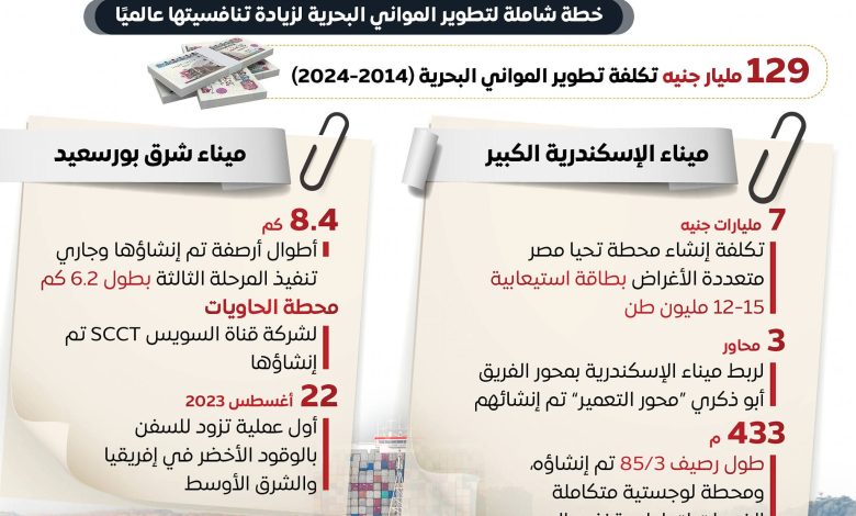 كما أوضح المركز أن الدولة أنفقت نحو 129 مليار جنيه على تطوير المواني البحرية خلال الفترة من 2014 إلى 2024، وشملت مشروعات كبرى في مواني الإسكندرية، شرق بورسعيد، السخنة، دمياط، ومواني البحر الأحمر، إلى جانب جذب أكبر الخطوط الملاحية العالمية، بما يدعم مكانة مصر كمحور رئيسي للنقل البحري وتجارة الترانزيت.