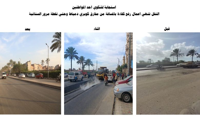 وعلي الفور قامت الهيئة العامة للطرق والكباري بتكليف شركة متخصصة في اعمال تنفيذ الطرق وذلك لصيانه سطح الرصف واستكمال القطاع الانشائي للطريق وفقا للمواصفات والاشتراطات الهندسية وذلك لعدم التأثير على حركه المرور بمدينة دمياط وزيادة الامان والسلامة المرورية على هذا القطاع من الطريق وتم الإنتهاء من كافة الاعمال بما يضمن سلامة المركبات والأفراد
