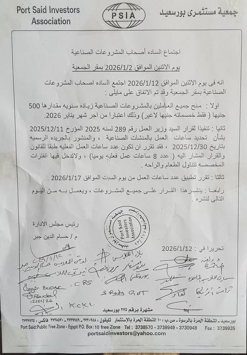 وكان أصحاب المنشآت الصناعية بالمنطقة الاستثمارية في بورسعيد قد أصدروا، في 12 يناير 2026، قرارًا يقضي بزيادة ساعات العمل الفعلية إلى ثماني ساعات يوميًا دون احتساب فترات الراحة والطعام، إلى جانب إقرار زيادة سنوية قدرها 500 جنيه فقط اعتبارًا من أجر يناير 2026، على أن يبدأ تطبيق القرار يوم السبت 17 يناير.