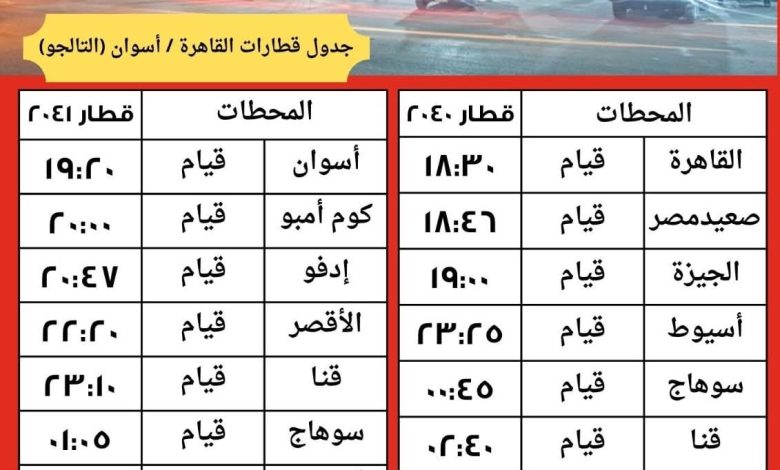 – اعتبارا من يوم الخميس الموافق 22/1/2026 تشغيل قطار 2040 (تالجو) من القاهرة/أسوان (يوم بعد يوم) حتي يوم الأحد الموافق 15/2/2026 حيث يقوم من القاهرة الساعة 18:30 ويصل أسوان الساعة 06:30 طبقاً للجدول المرفق.