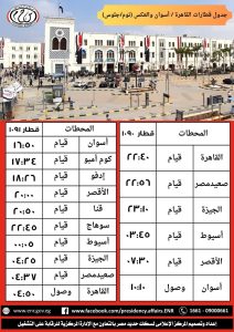 ويذكر أنه قد أعلنت الهيئة عن تشغيل عدد 2 قطار بعربات ( نوم / Premium ) اعتباراً من يوم السبت الموافق 7 / 2 / 2026 ، حيث تقرر تشغيل قطار 1090 بعربات مختلطة (نوم / VIP PREMIUM ) من القاهرة إلي أسوان على أن يعمل أيام السبت والاثنين والأربعاء من كل أسبوع يقوم من محطة القاهرة الساعة 22.40 يصل لمحطة أسوان الساعة 10.10 صباح اليوم التالي ، وكذلك إعتباراً من يوم الاحد الموافق 8 / 2 / 2026 تشغيل قطار 1091 بعربات مختلطة (نوم / VIP PREMIUM ) من أسوان إلى القاهرة على أن يعمل أيام الأحد والثلاثاء والخميس من كل اسبوع ويقوم من محطة أسوان الساعة 16.50 يصل لمحطة القاهرة الساعة 04.50 صباح اليوم التالى طبقا للجداول المرفقة .