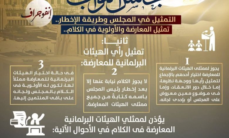– يجوز لممثلى الهيئات البرلمانية للمعارضة اختيار أحدهم بالإجماع لتمثيل رأيها ووجهة نظرها، إما خلال دور الانعقاد، وإما فى موضوع معين معروض على المجلس أو بإحدى لجانه