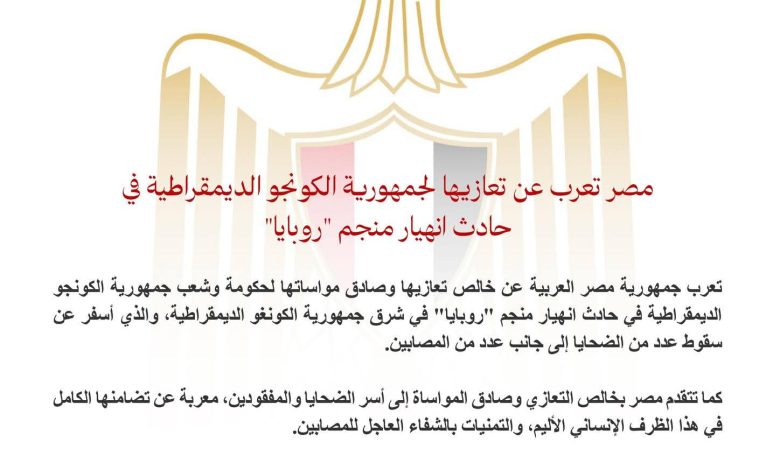 أعربت وزارة الخارجية المصرية عن خالص تعازيها وصادق مواساتها لحكومة وشعب جمهورية الكونغو الديمقراطية في حادث انهيار منجم “روبايا” شرق البلاد، الذي أسفر عن سقوط عدد من الضحايا وإصابة آخرين.