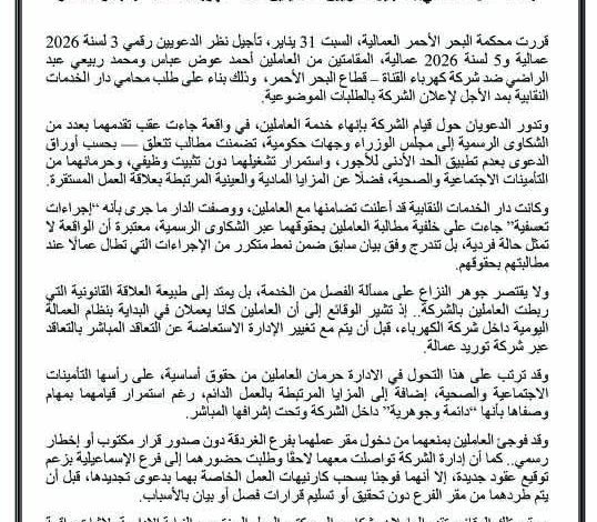 بعد الفصل التعسفي.. تأجيل دعويين عماليتين ضد “كهرباء القناة” بالبحر الأحمر