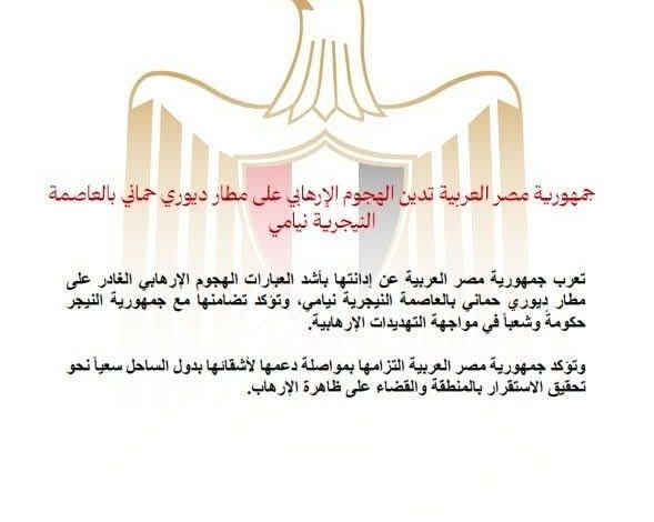 أعربت جمهورية مصر العربية عن إدانتها الشديدة للهجوم الإرهابي الغادر الذي استهدف مطار ديوري حماني بالعاصمة النيجرية نيامي، مؤكدة رفضها القاطع لكافة أشكال العنف والإرهاب.