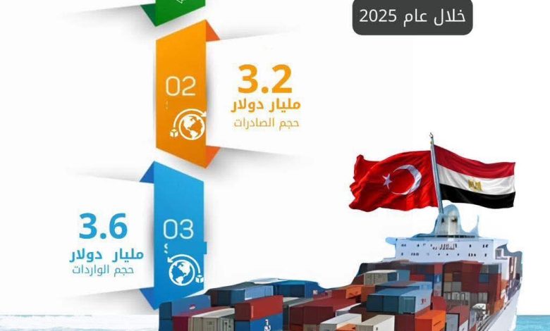 وسجلت الصادرات المصرية إلى تركيا 3.2 مليار دولار مقابل 3.4 مليار دولار خلال العام السابق، بينما بلغت الواردات المصرية من تركيا 3.6 مليار دولار مقابل 3.2 مليار دولار في 2024.