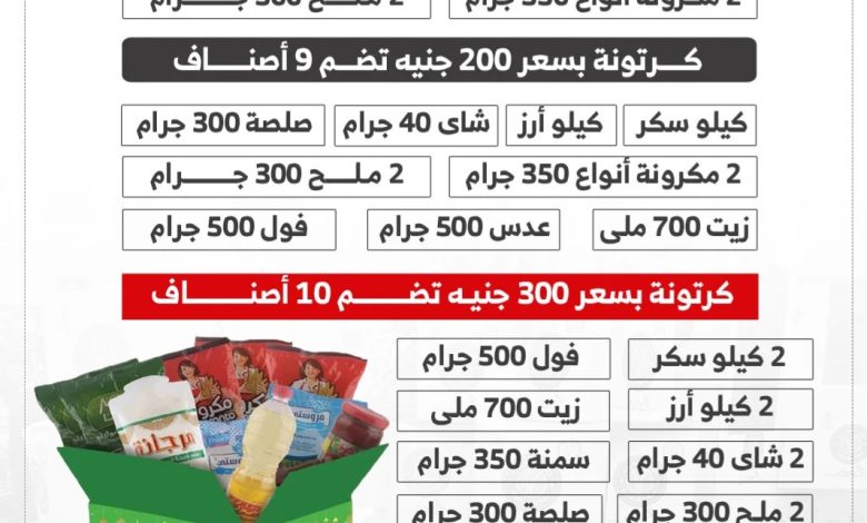 كرتونة 300 جنيه: 10 أصناف تشمل المنتجات السابقة + كيلو بلح – سمنة 350 جرام – ضعف كمية السكر والأرز والشاي.