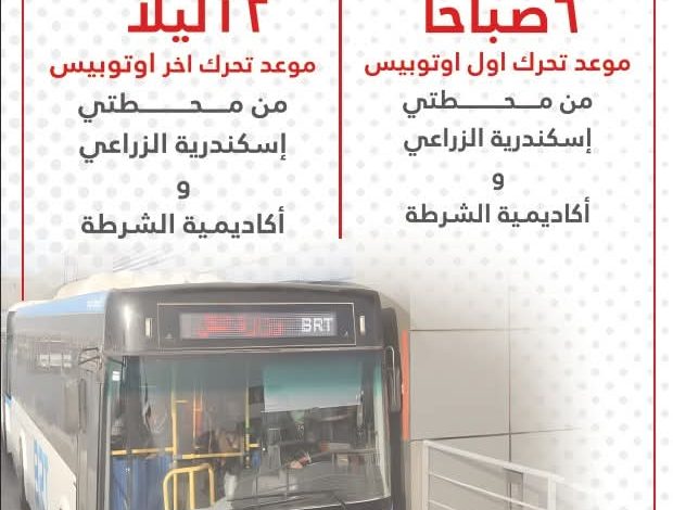 ضمن خطة وزارة النقل لتيسير حركة التنقل اليومية للمواطنين تعلن الشركة المصرية للأتوبيس الترددي عن مواعيد العمل خلال شهر رمضان المبارك حيث يتم تحرك أول أتوبيس من محطتي أكاديمية الشرطة – ومحطة اسكندرية الزراعي في تمام الساعة السادسة صباحاً .