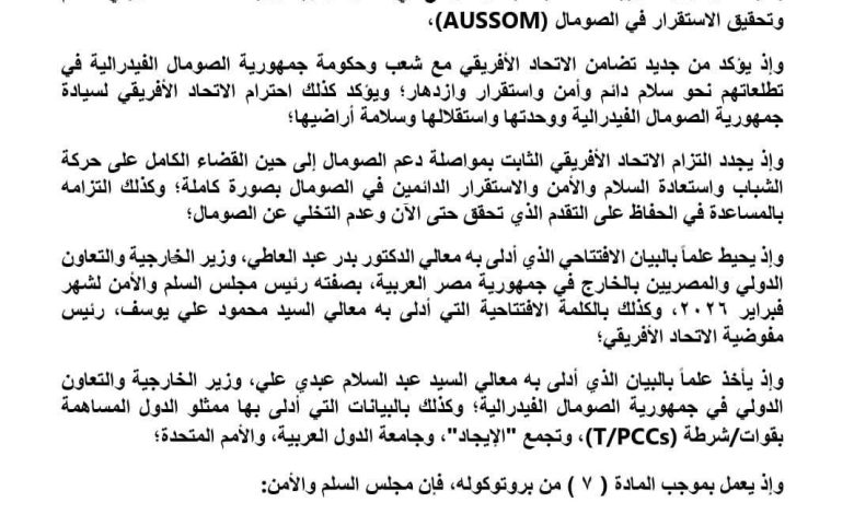 وقد تم اعتماد البيانين تحت الرئاسة المصرية للمجلس، فى انعكاس للدور الفاعل الذي تضطلع به مصر في دعم منظومة السلم والأمن الأفريقي، وحرصها على تعزيز التنسيق المشترك للتعامل مع الأزمات القائمة في القارة. وجدد المجلس التزامه بمواصلة متابعة تطورات الأوضاع في الصومال والسودان، وتفعيل الأدوات المتاحة للاتحاد الأفريقي لدعم مسارات الحلول السياسية والحفاظ على استقرار المنطقة.