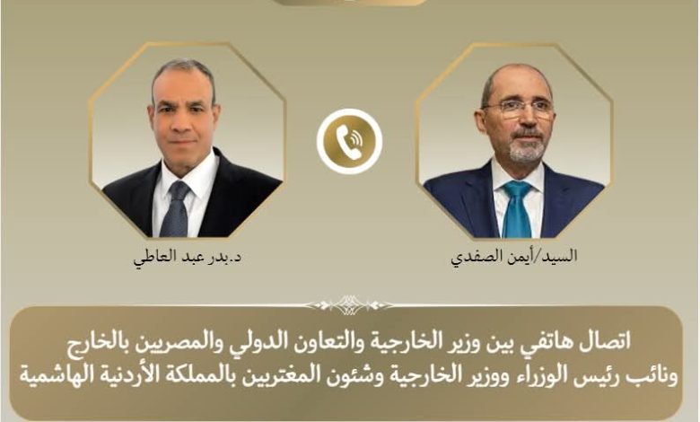 جرى اتصال هاتفي، يوم الجمعة ١٣ فبراير، بين د. بدر عبد العاطي وزير الخارجية والتعاون الدولي والمصريين بالخارج، والسيد أيمن الصفدي نائب رئيس الوزراء ووزير الخارجية وشئون المغتربين بالمملكة الأردنية الهاشمية الشقيقة، وذلك في إطار التشاور والتنسيق المستمر بين البلدين الشقيقين حول تطورات الأوضاع الإقليمية، وبحث سبل تعزيز التنسيق المشترك إزاء القضايا ذات الاهتمام المتبادل.