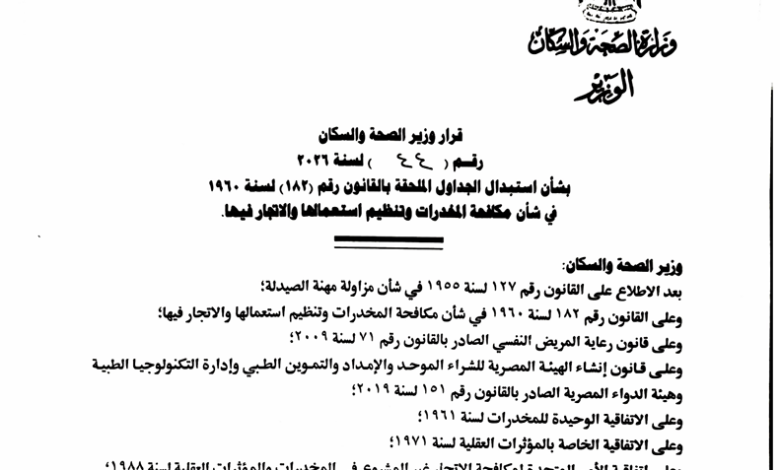 أصدر الدكتور خالد عبدالغفار، وزير الصحة والسكان، القرار الوزاري رقم (44) لسنة 2026، بشأن استبدال الجداول الملحقة بقانون مكافحة المخدرات وتنظيم استعمالها والاتجار فيها رقم (182) لسنة 1960، وذلك في استجابة فورية لحكم المحكمة الدستورية العليا الصادر في 16 فبراير 2026، في الدعوى رقم (33) لسنة 47 قضائية دستورية.