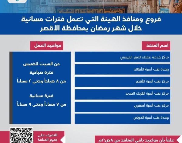 وأكدت الهيئة أنه تقرر مد ساعات العمل المسائية ببعض الفروع والمنافذ، لمواجهة زيادة الإقبال على الخدمات الصحية خلال الشهر الكريم، وتوفير مرونة أكبر في أوقات تقديم الخدمة.
