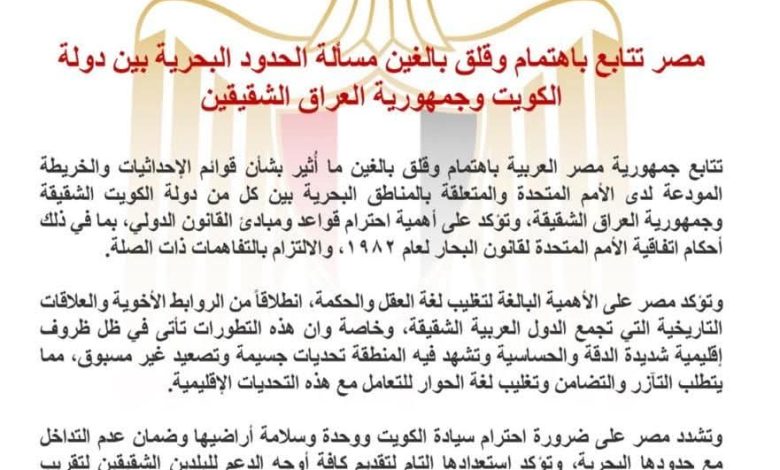 أصدرت وزارة الخارجية والتعاون الدولي والمصريين بالخارج بيانًا أوضحت فيه أن جمهورية مصر العربية تتابع باهتمام وقلق ما أُثير حول قوائم الإحداثيات والخريطة المودعة لدى الأمم المتحدة المتعلقة بالمناطق البحرية بين دولة الكويت وجمهورية العراق. وشددت مصر على ضرورة الالتزام بالقانون الدولي، بما في ذلك أحكام اتفاقية الأمم المتحدة لقانون البحار لعام 1982، والتقيد بالتفاهمات السابقة ذات الصلة.