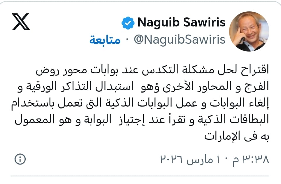 وأوضح ساويرس، عبر حسابه الرسمي على منصة “إكس” (تويتر سابقاً)، أن الحل الأمثل يكمن في إلغاء نظام التذاكر الورقية والبوابات التقليدية التي تتسبب في توقف حركة السير، واستبدالها بنظام “البوابات الذكية”.