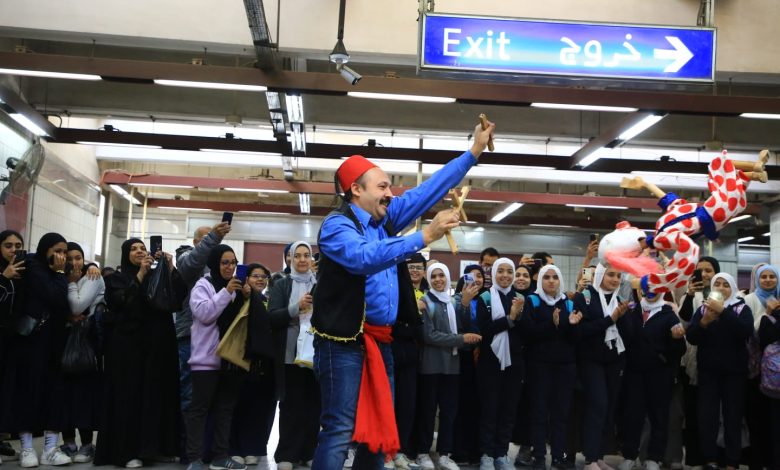 شاهد بالفيديو والصور …. خلال منتصف شهر رمضان المبارك إحتفالية بعرض ترحيبي وتوعوي بالعرائس والأراجوز للأطفال من جمهور الركاب داخل محطة مترو جامعة القاهرة بالخط الثاني والثالث