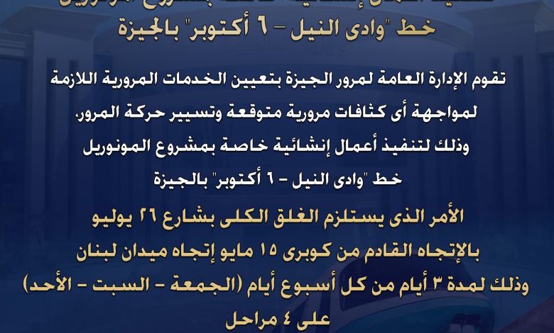 تقوم الإدارة العامة لمرور الجيزة بتعيين الخدمات المرورية اللازمة لمواجهة أى كثافات مرورية متوقعة وتسيير حركة المرور، وذلك لتنفيذ أعمال إنشائية خاصة بمشروع المونوريل خط “وادى النيل – 6 أكتوبر” بالجيزة.