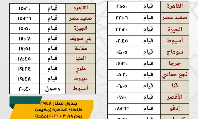 اولا : يوم الثلاثاء الموافق 3/17/ 2026 فقط يتم تشغيل قطار مخصوص مكيف رقم 1954 بين االقاهرة / اسيوط ليقوم من القاهرة الساعة 15:20ويصل اسيوط الساعة 20:40 طبقا للجدول المرفق
