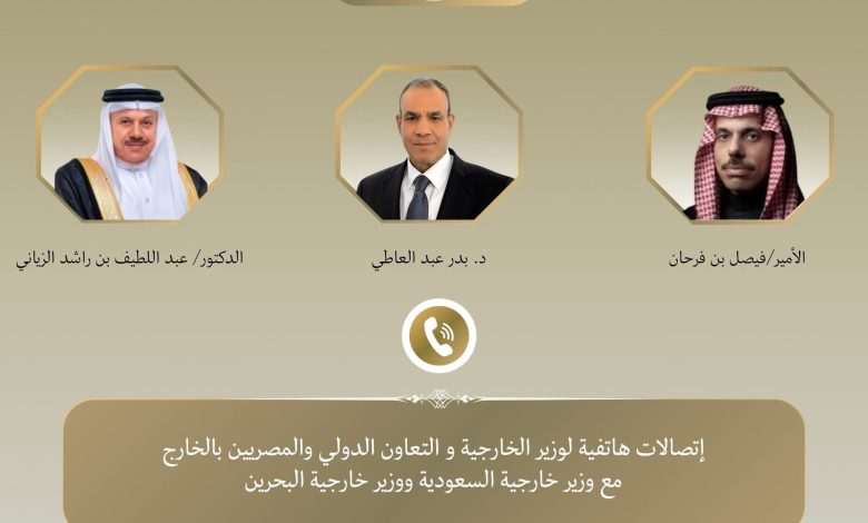 جرى اتصالان هاتفيان بين د. بدر عبد العاطي وزير الخارجية والتعاون الدولي والمصريين بالخارج، وكل من صاحب السمو الأمير فيصل بن فرحان وزير خارجية المملكة العربية السعودية الشقيقة، والدكتور عبد اللطيف بن راشد الزياني وزير خارجية مملكة البحرين الشقيقة، يوم الأربعاء ٢٥ مارس، وذلك في إطار التشاور والتنسيق المستمر إزاء التطورات الإقليمية المتسارعة.