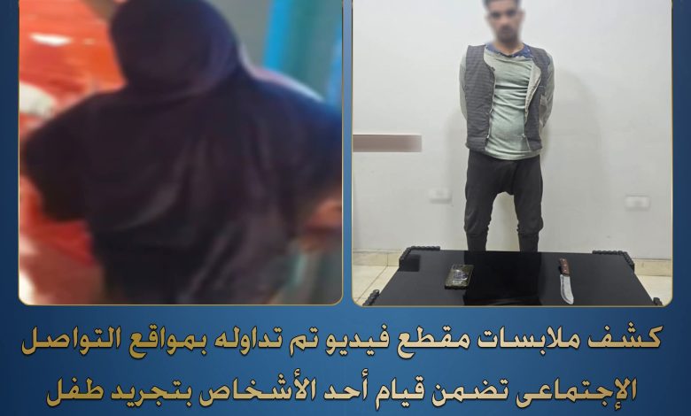 كشفت الأجهزة الأمنية بوزارة الداخلية ملابسات مقطع فيديو تم تداوله على مواقع التواصل الاجتماعي، تضمن قيام أحد الأشخاص بالتعدي على طفل وتجريده من ملابسه وربطه بحبل داخل أحد المنازل، وتهديده باستخدام سلاح أبيض.